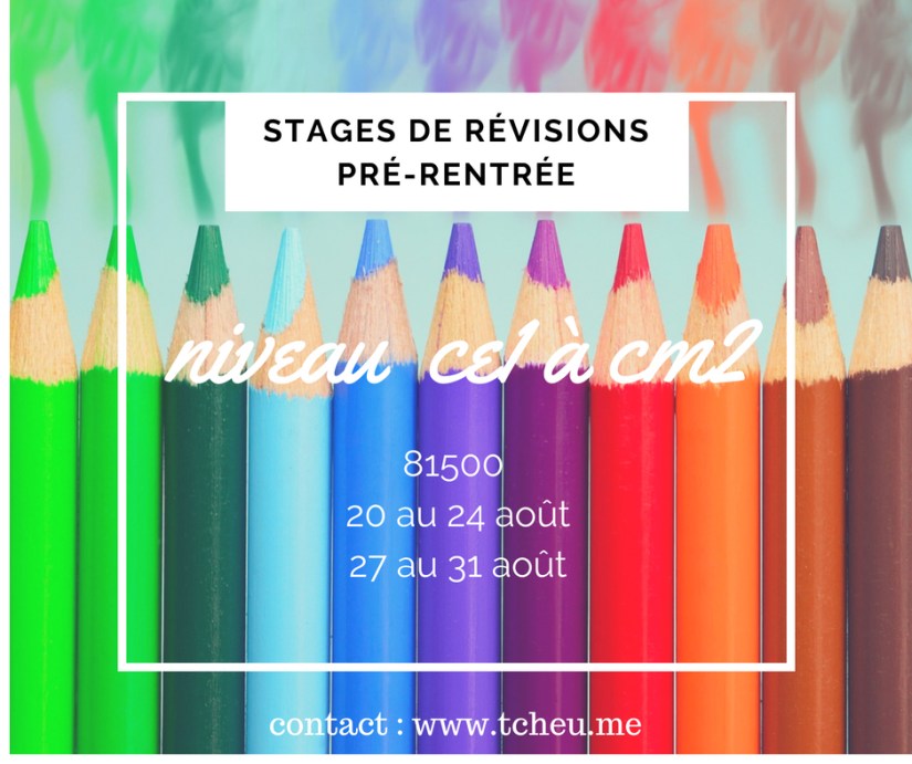 Stages pré-rentrée 2018 30 juillet 201830 juillet 2018 tcheucontact stages en petits groupes 2h / jour du lundi au vendredi pour plus d’informations, contactez-moi ici Partager : Cliquer pour partager sur X(ouvre dans une nouvelle fenêtre) X Cliquez pour partager sur Facebook(ouvre dans une nouvelle fenêtre) Facebook J’aime chargement… Publié par tcheucontact Voir tous les articles par tcheucontact